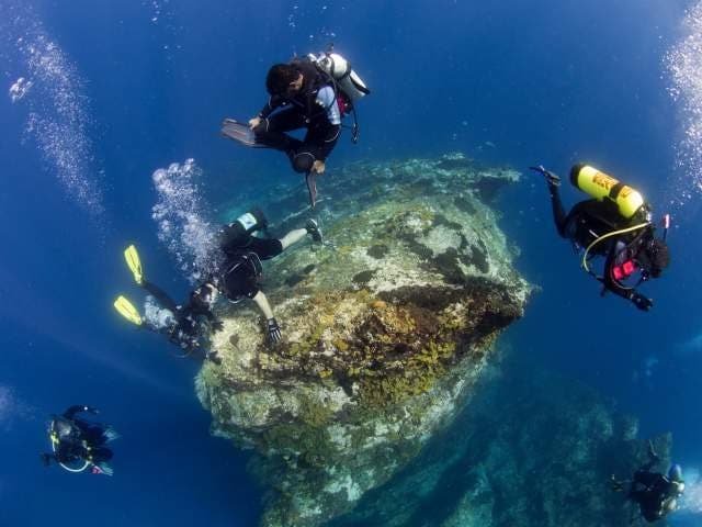 Adecuada para buzos de todos los niveles, el punto  de buceo poco profundo, Pirámides, de 18 metros, es una inmersión a la deriva alrededor de grandes rocas y piedras que se cayeron al mar, creando un montón de grietas y pasadizos repletas de coloridos corales para explorar.